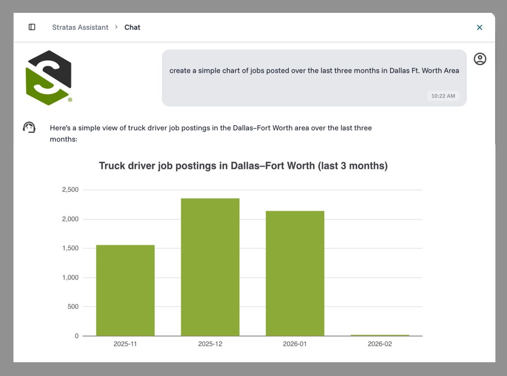 With Stratas Assistant, driver recruiting leaders can type a question and get insights based on recent recruiting market data within seconds. The Assistant will return key performance metrics, identify and explain trends, or generate charts, making it easier for users to understand the hiring market and make informed decisions. Without having to navigate dashboards or hunt down data, users can check cost-per-lead and lead-to-hire rates by metro area, find where their job offerings are most competitive, or visualize top-performing markets.